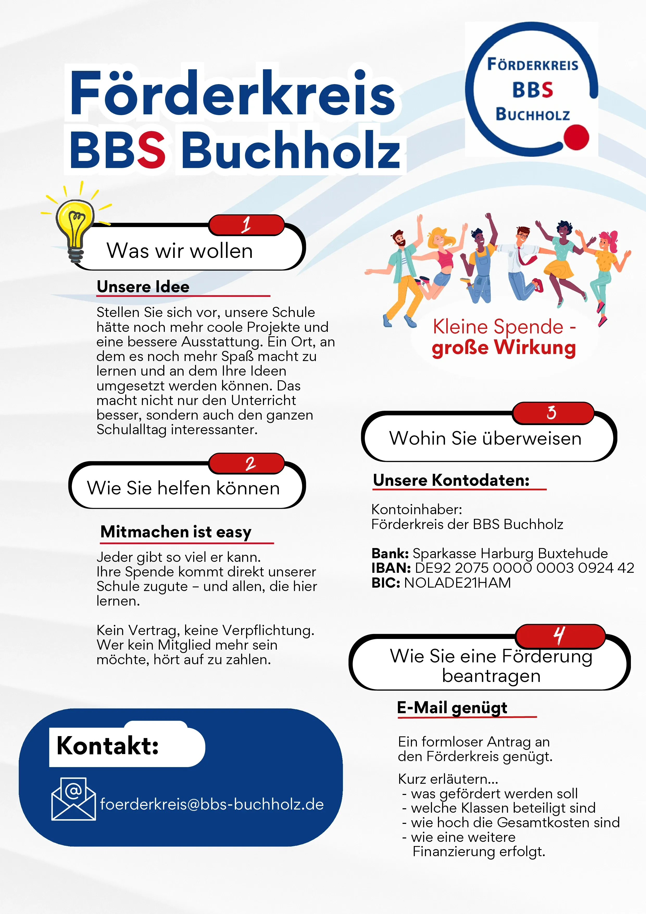 Anträge und Anfragen können unkompliziert per E-Mail an den Förderkreis gestellt werden: foerderkreis@bbs-buchholz.de